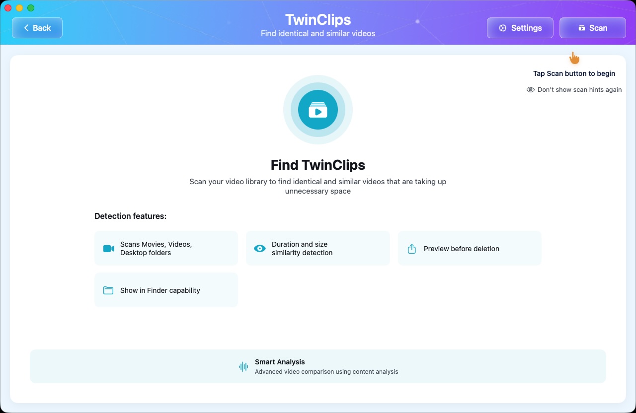 Twin Clips is our specialized video duplicate finder. It analyzes video content to identify exact duplicate video files regardless of filename or location. Whether you've downloaded the same movie twice or have backup copies scattered across drives, Twin Clips finds them all.